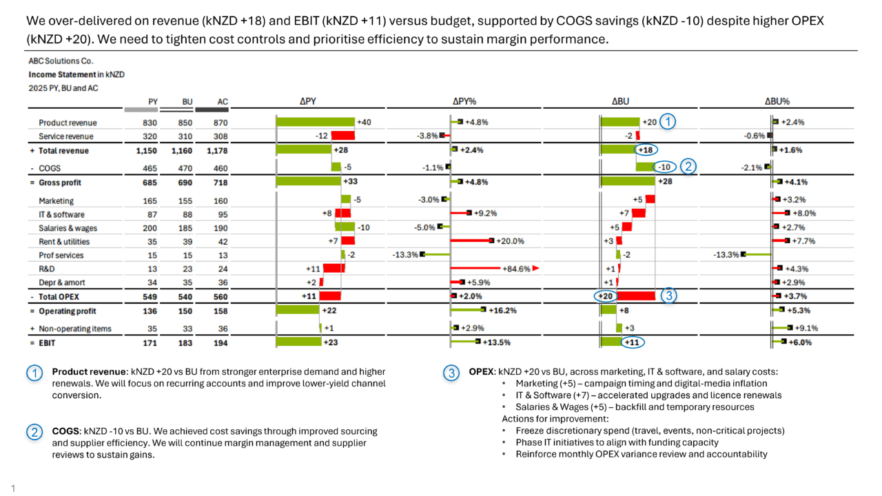 Work sample 1 The P&L Performance One-Pager integrates a structured table and charts to show actual results and variances versus prior year and budget. IBCS semantic notation is rigorously applied to visualise the calculation scheme, the grouping structure (row gaps and a broken y-axis), and the favourable (green) and unfavourable (red) variances that differ from mere positive or negative values for clearer interpretation.
