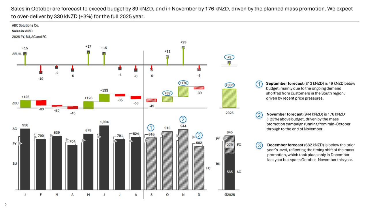 Work sample 2 The Monthly Sales Performance One-Pager provides a clear monthly overview combining actuals, forecasts, and full-year outlooks in a consistent layout that highlights key drivers and trends. It is designed to communicate performance transparently while aligning visual language and notation with IBCS® principles.