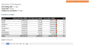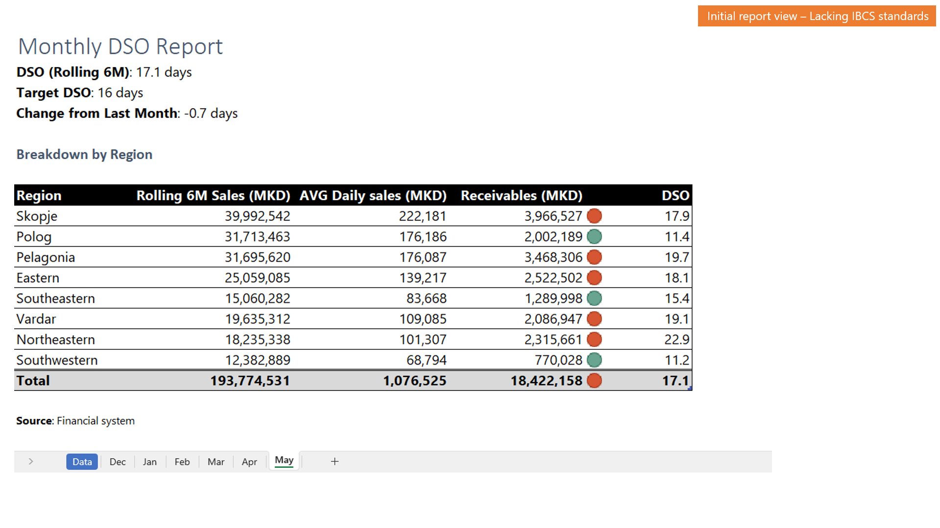 The first slide shows the traditional Excel-based DSO report. It stores each month’s data for a rolling six-month period on a separate sheet. This format makes it difficult to see trends, compare performance, or derive actionable insights.