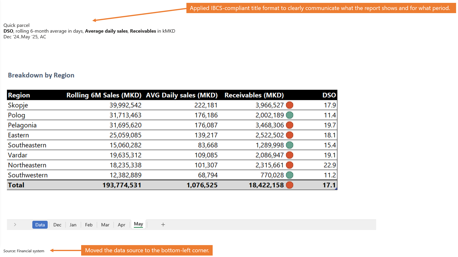 The transformation starts by applying an IBCS-compliant title format to clearly state the report’s content and period.
