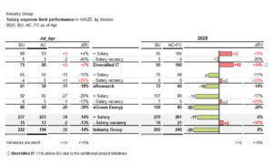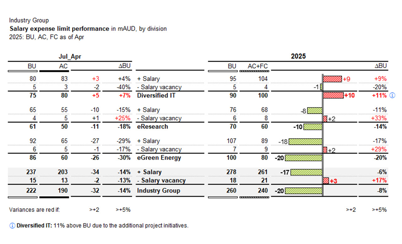 The optimised table presents a division-centric view, comparing the Jul-Apr and 2025 periods with budget, and actual plus forecast (AC+FC), absolute and relative variances, and includes colour highlights as per performance rationale. The table uses nested rows to iteratively calculate the ‘Salary expense limit’ by division.