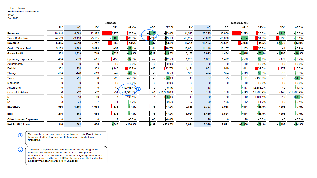 Work sample 1 - Profit & loss comparative The table applies IBCS standards by using a clear, structured layout with consistent row definitions, time horizons, and variance columns, enabling straightforward comparison between actuals, prior year, and forecast. Standardised variance measures (absolute and percentage) and consistent colour semantics for positive and negative deviations support quick interpretation of performance drivers. The focus on material line items, logical grouping, and explanatory annotations reinforces message-oriented reporting and decision relevance.