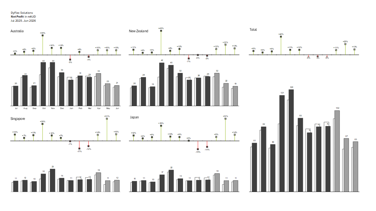 Work sample 2 - Net profit trends by region This dashboard aligns with IBCS standards through consistent use of chart types, colours, and semantics, enabling quick and intuitive comparison across regions and time periods. Variances are clearly highlighted using standardised colour conventions (e.g. positive vs negative), while actuals, prior year, and forecasts are presented in a structured and repeatable layout. The clear separation of totals and regional views, along with concise labelling and minimal visual clutter, supports accurate interpretation and decision-focused storytelling.