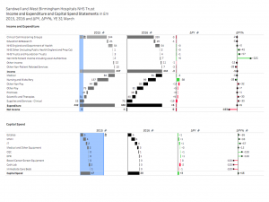The original report included the information in several tables, pie charts and text and was spread across multiple pages. Some of the absolute amounts had to be re-engineered from the values in the text and the percentages shown in the pie charts. This approach clearly shows where there have been increases and decreases in income and spend.
