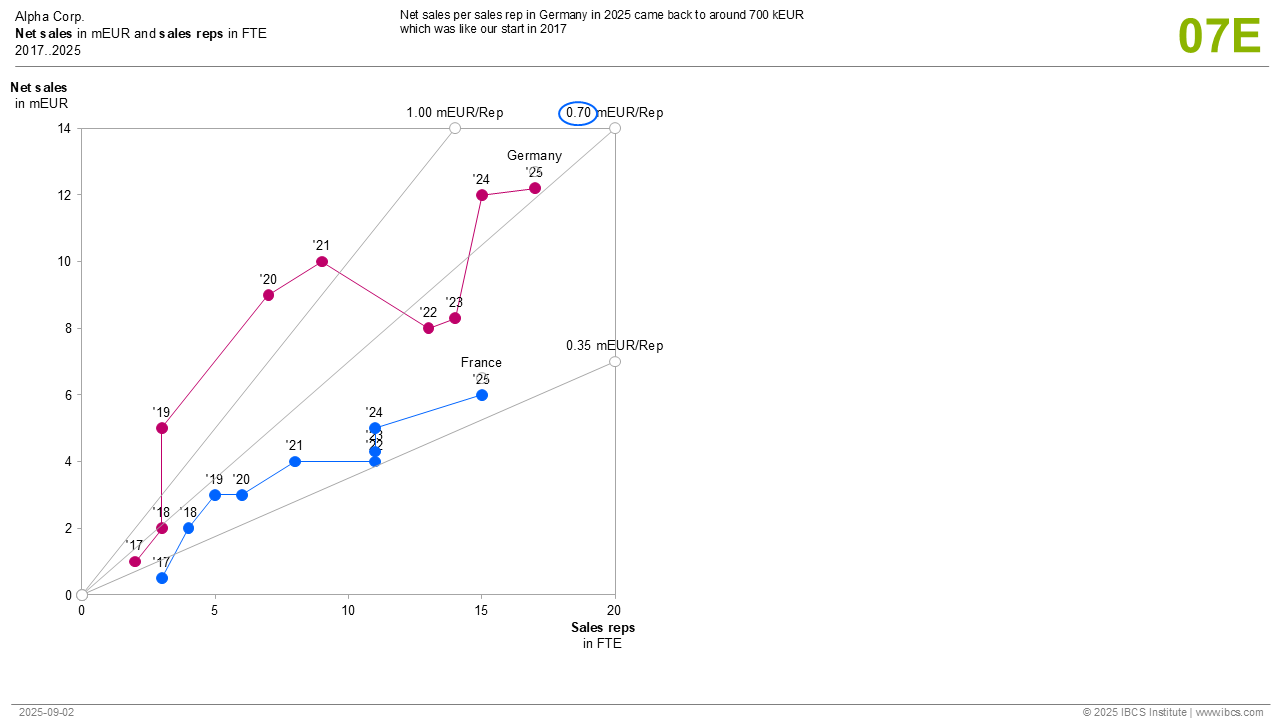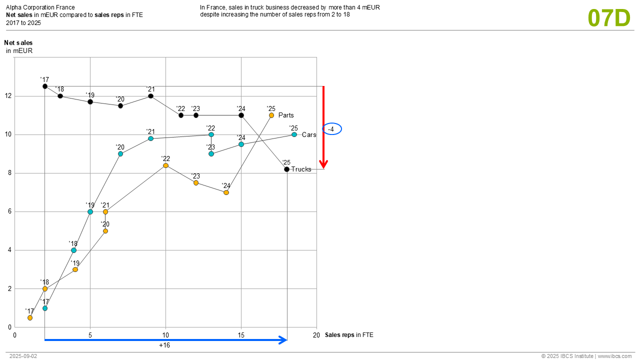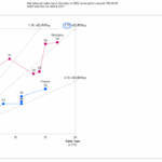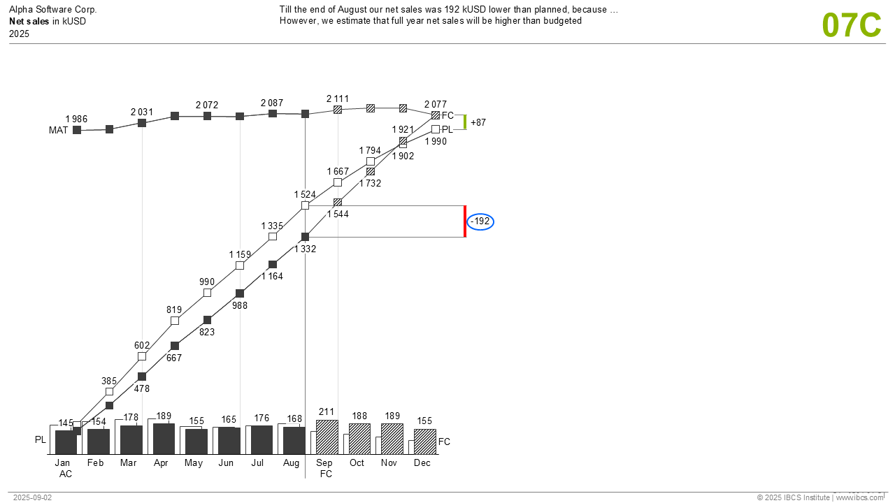 Different than column charts, line charts can be used best if more than 10 time periods are presented, even hundreds of values can be presented. Showing as well positive and negative values is no problem. Especially when presenting only few values, the connecting line of the data points gives the impression of a continuous data stream, which is not the case in business applications. Therefore line charts must show line markers to underline that the lines do not show any existing values but are used as connecting lines only. If the data points of different lines are not far apart, labeling is difficult.