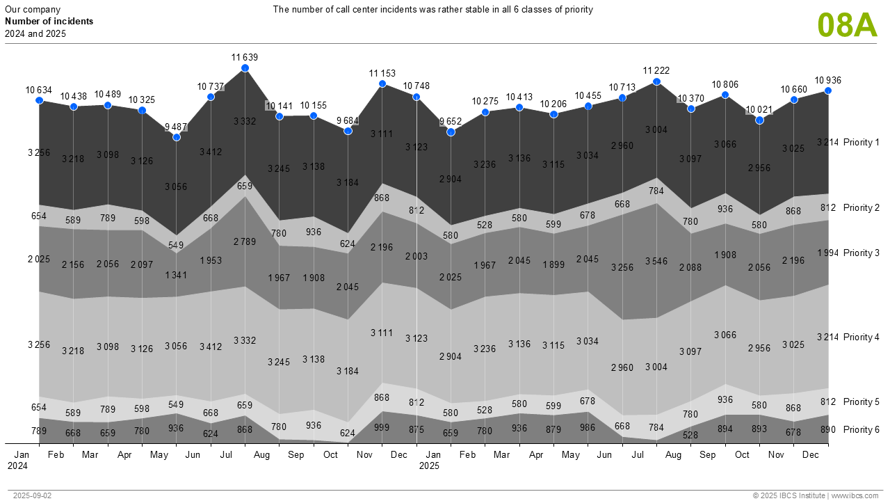 Different than column charts, area charts can be used best if more than 10 time periods are presented, even hundreds of values can be presented. If at all, showing negative and positive values is only possible for the lowest data series. The temporal development of only the lowest data series and the total can be analyzed well. Especially when presenting only few values, the connecting areas gives the impression of continuous data streams, which is not the case in business applications. Markers like in line charts cannot solve this problem because the values of area charts are not represented by the lines themselves but by the vertical difference between two lines.