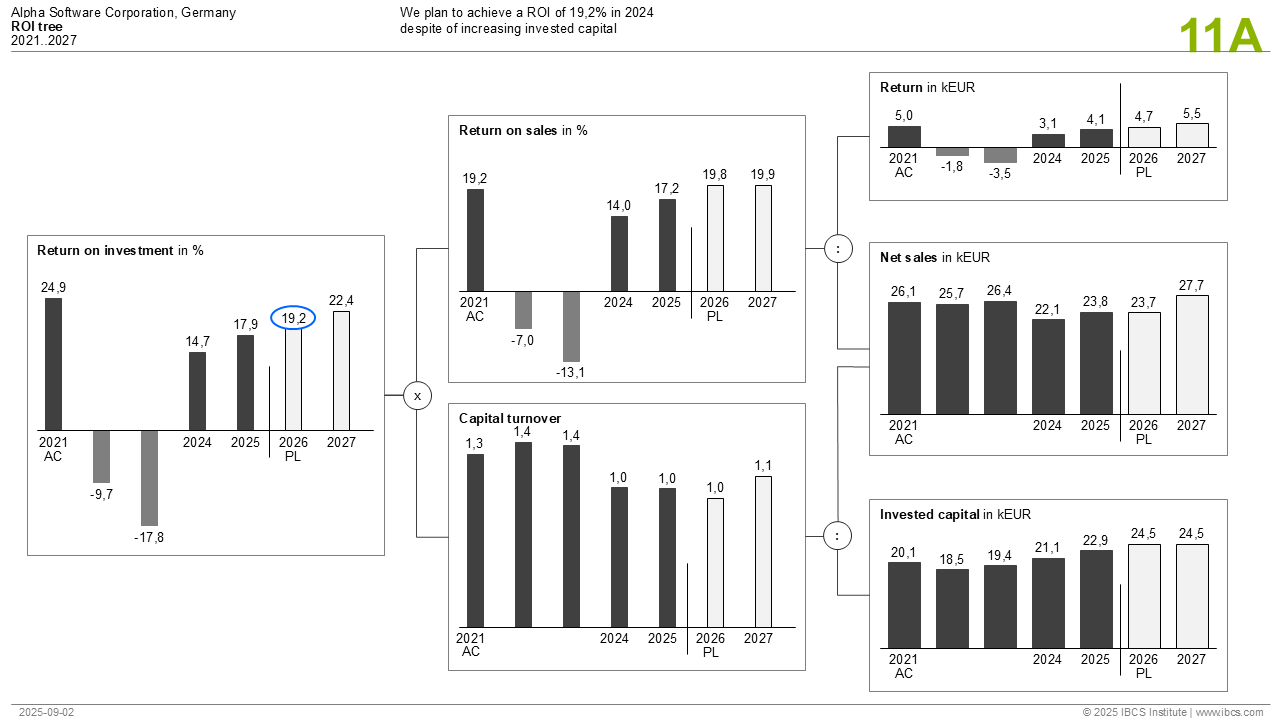 In the right chart column it shows the yearly development of the basic values „Return“, „Net sales“ and „Assets“. In the middle chart column two ratios are calculated which lead to „Return on assets“ in the left chart column. This chart type can be used best, if the mathematical relationship of two or more measures over time have to be presented. The number of time periods can be from 2 or 3 up to 8 or 15 in each chart.