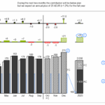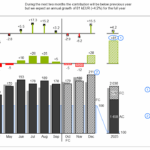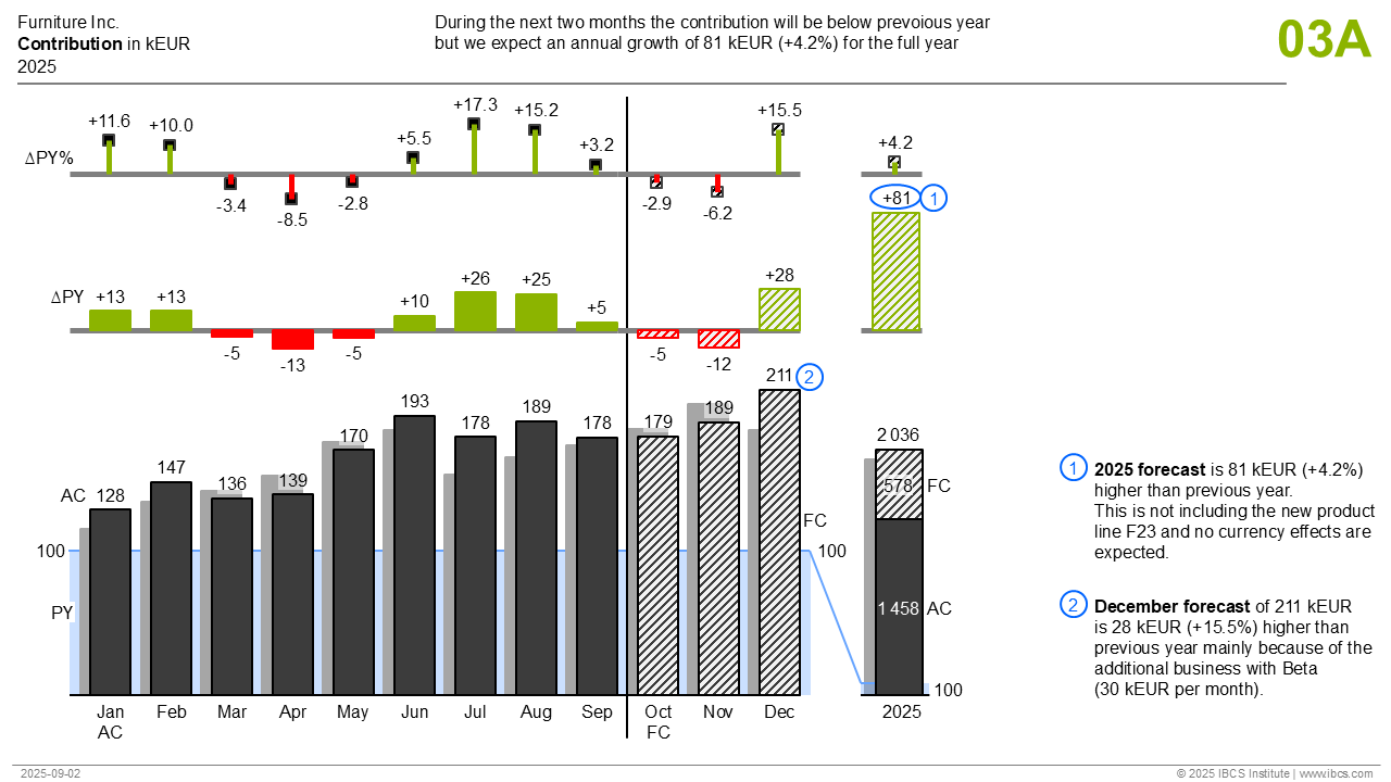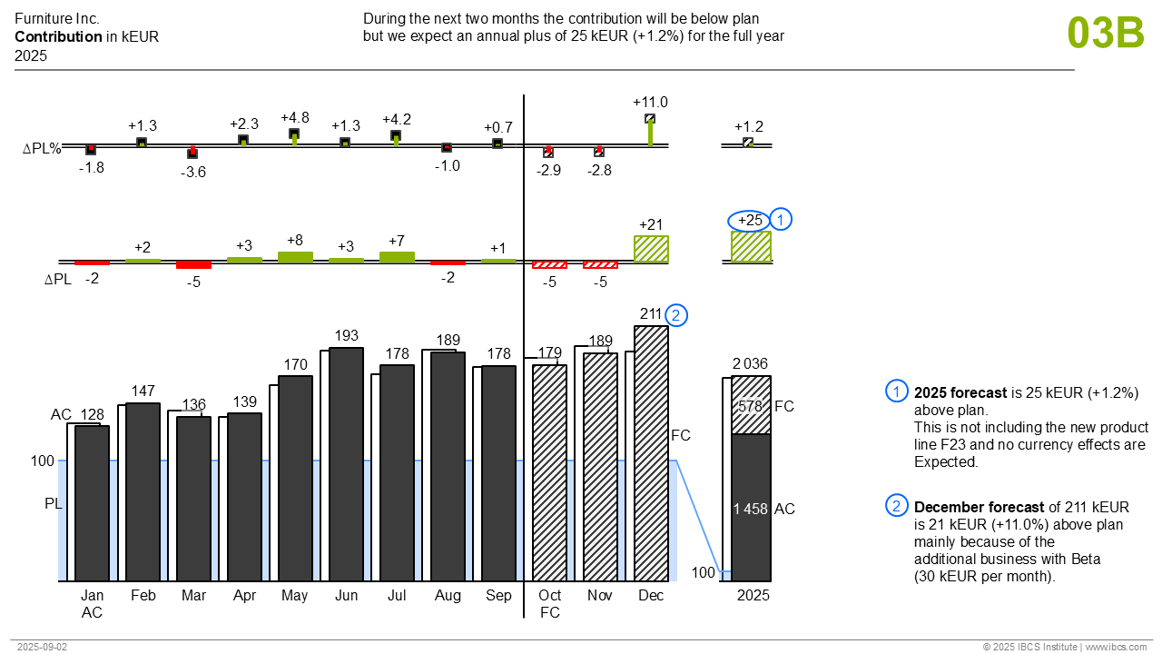 The multi-tier column chart contains three parts. In a first tier, this template compares different scenarios in a grouped column chart. The second and third tiers show different absolute and relative variance charts. E.g., these 3-tier charts are being used to analyze the temporal development of different scenarios.
