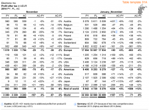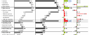 In this table template the pure figure columns of absolute and relative variances are replaced by waterfall bars and pins.