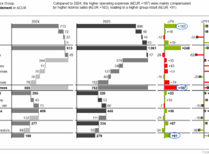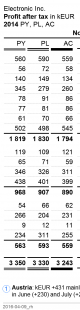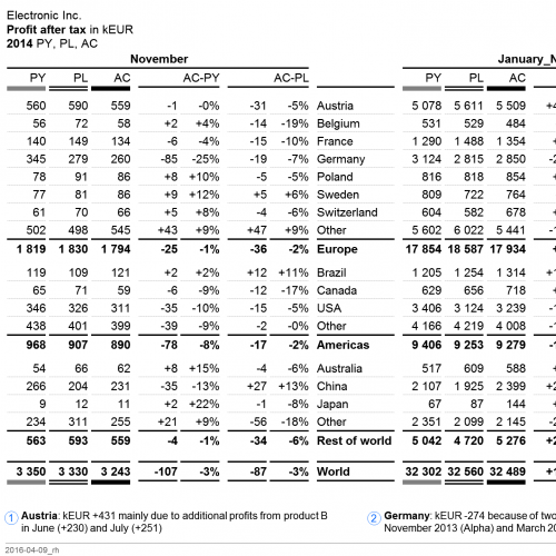 Table template 04 is based on the same data as template o3. Here the pure figure columns of absolute and relative variances are replaced by waterfall bars and pins.