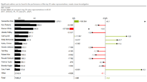 Ranking the reps by actuals and providing clear variance charts enables immediate identification of top performers and outliers, turning data into a clear management tool. Initelligently removing the visual bar for the Others category supports the visual focus on what matters.