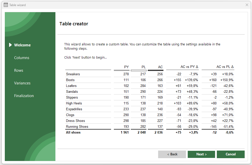 - Custom table creator – quickly create your perfect tables fully compliant with IBCS layouts – with support for multiple sections, variance calculations and more.